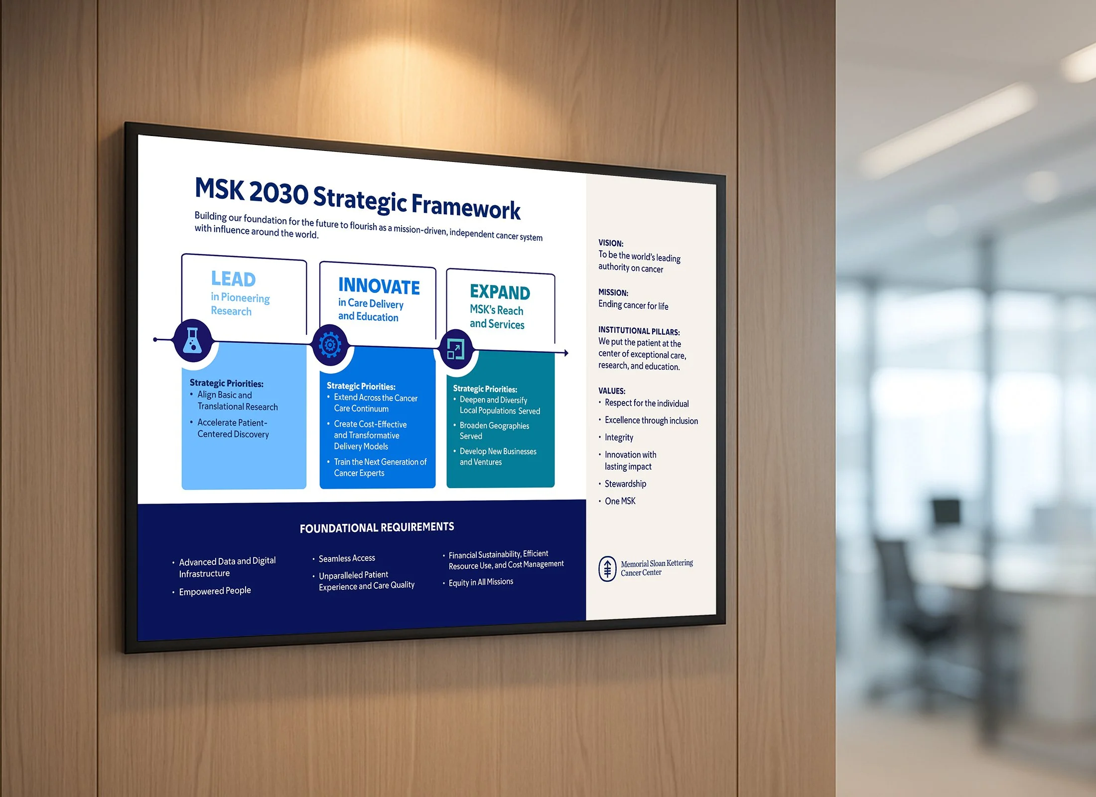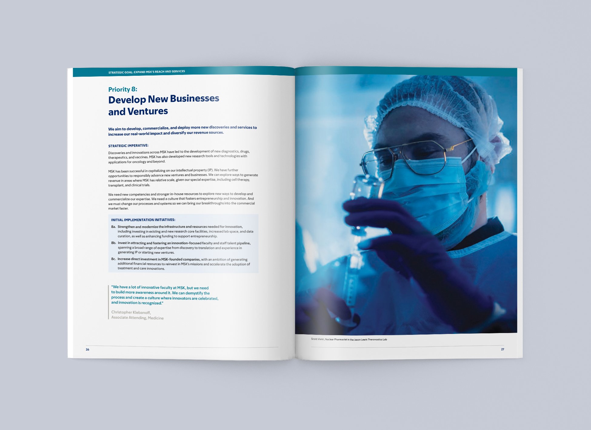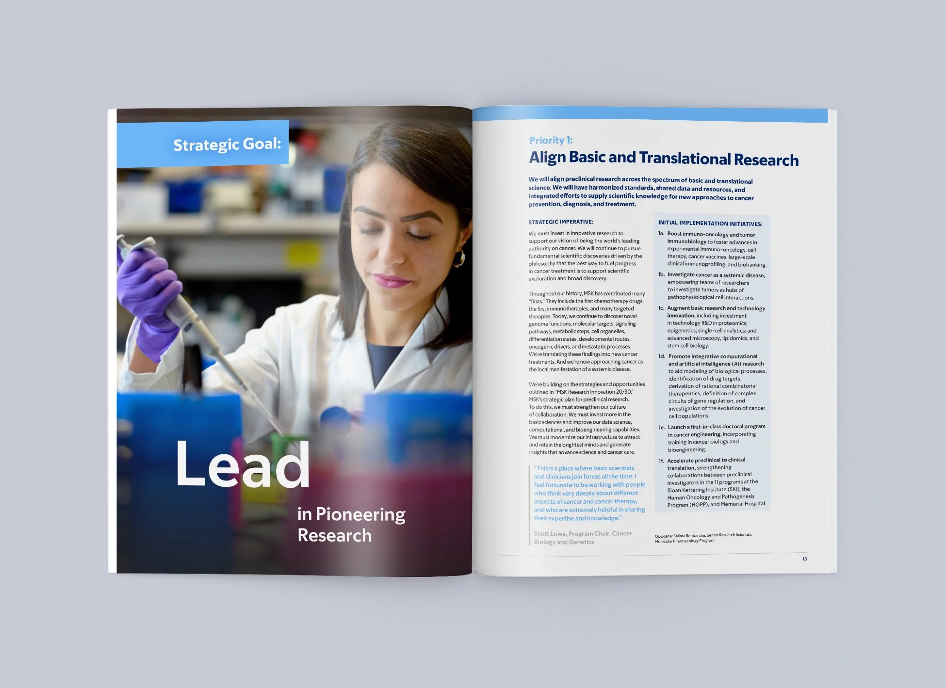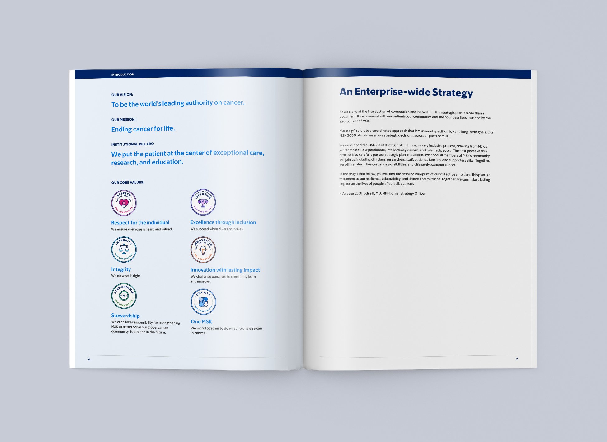I designed the layout for Memorial Sloan Kettering Cancer Center’s Strategic Report, a publication highlighting the institution’s priorities across clinical care, research, and education. The design approach focused on creating a clean, digestible layout that made complex information accessible, while maintaining a polished, on-brand look consistent with MSK’s visual identity. The final piece reflects the organization's forward-thinking vision and commitment to shaping a meaningful future.