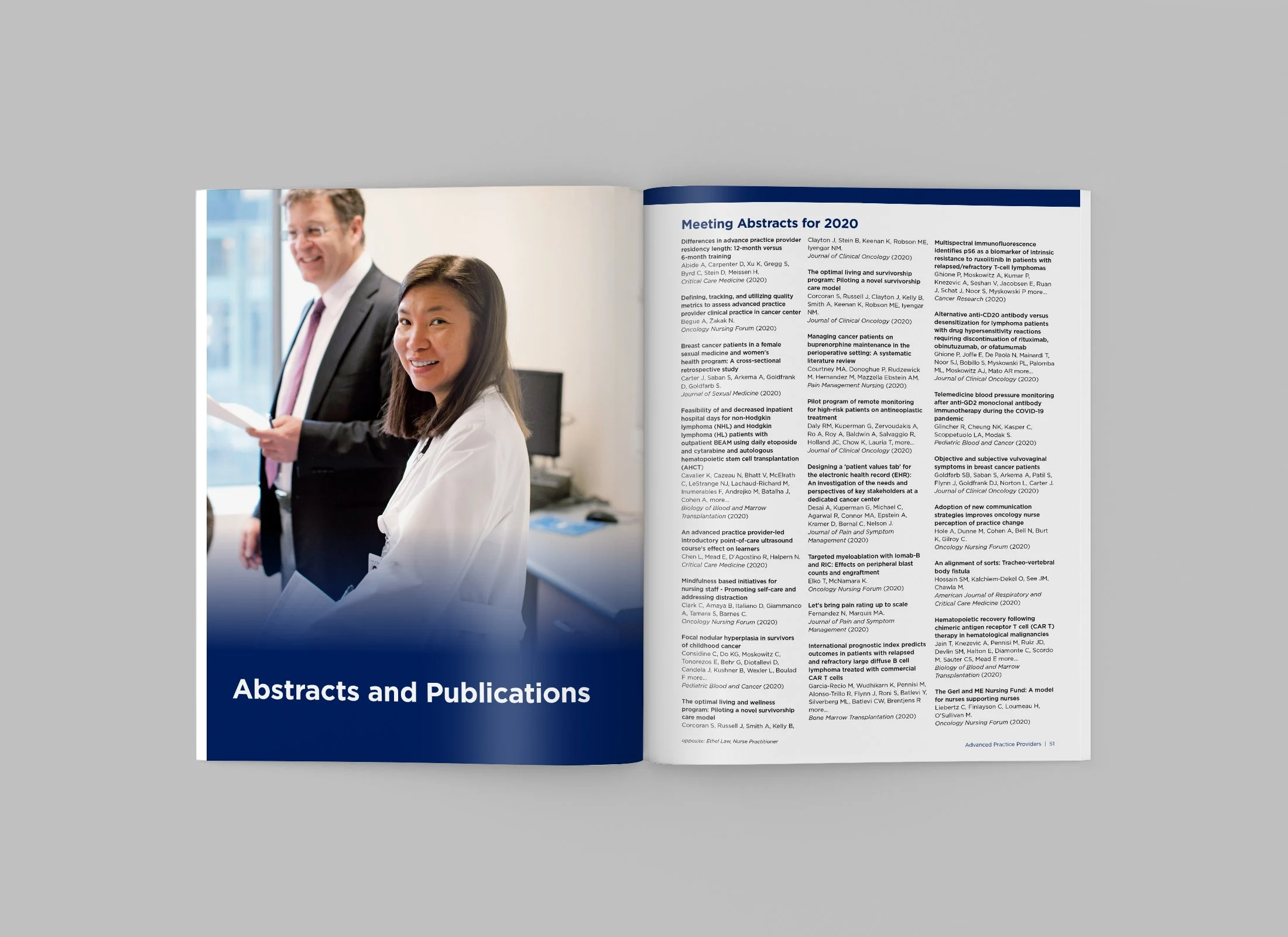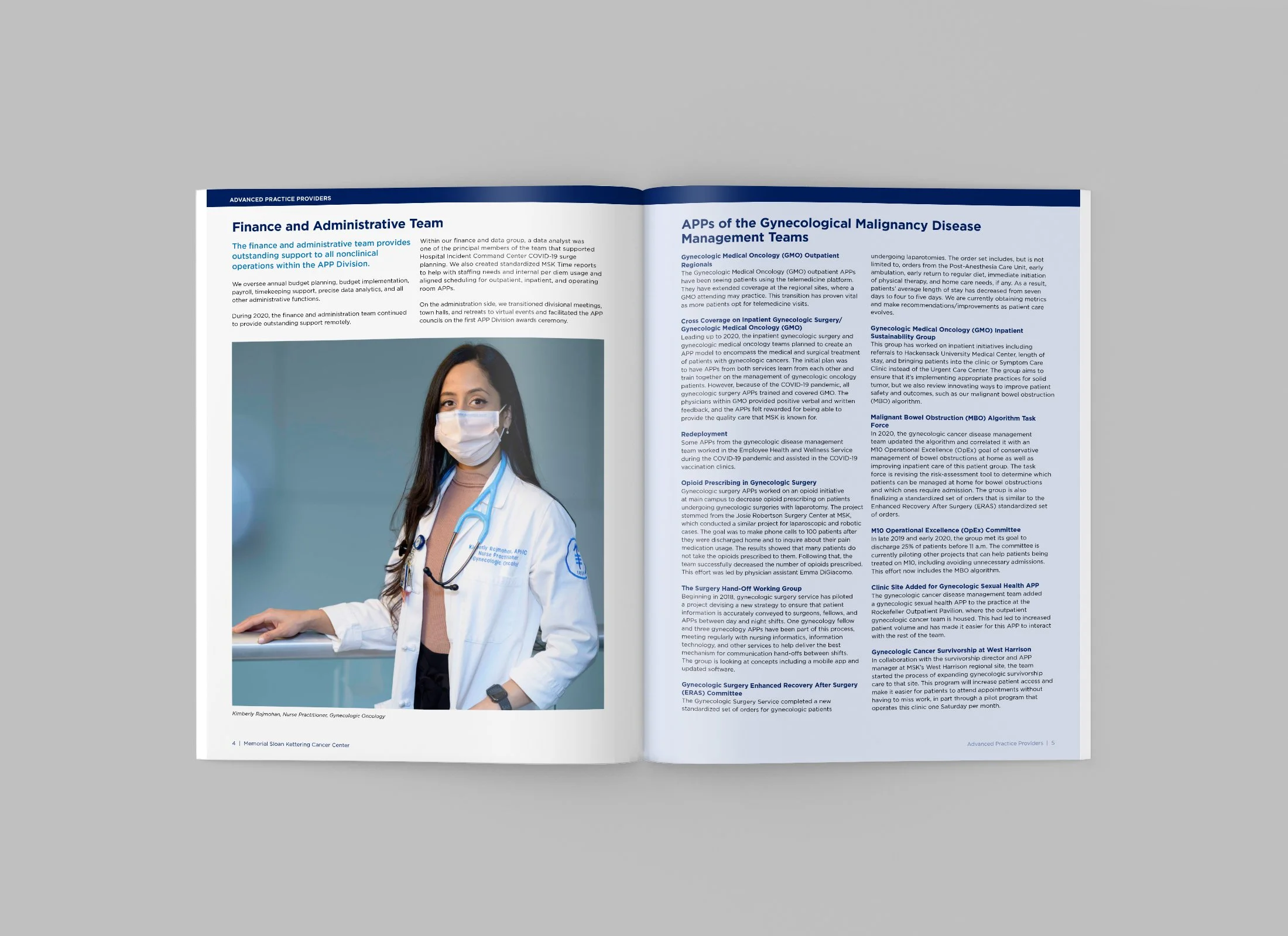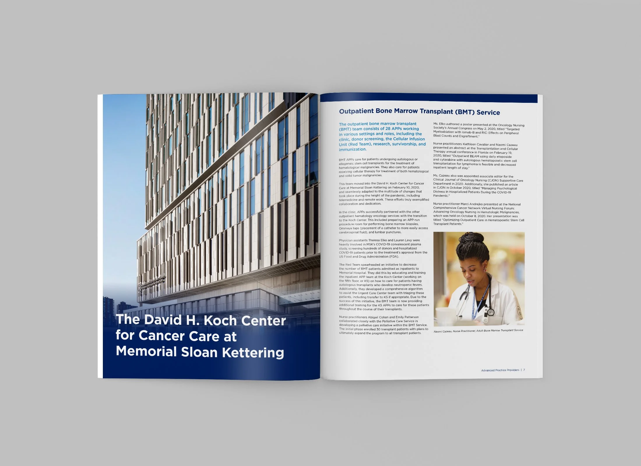 The MSK Advanced Practice Providers Annual Report highlights the dedication and expertise of APPs, featuring each clinical team, their response to COVID-19, the opening of the Josie Robertson Surgical Center, and staff abstracts. Each section celebrates the innovation, commitment, and resilience of MSK’s APP community. I designed the full-color cover and interior layouts and managed production, ensuring a polished, cohesive presentation from manuscript to print.